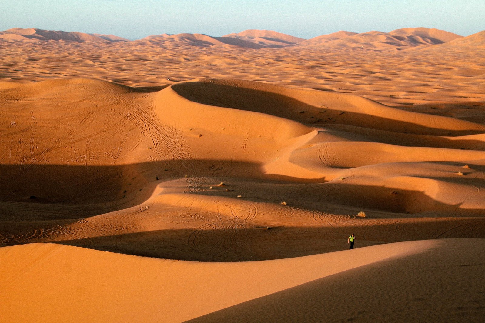 Departing at 8:30 a.m., you head south from Ouarzazate toward Agdez, crossing the Tizi-n-Tinfifte pass in the Anti-Atlas and descending to reveal the vast Dra’a Valley with its thousands of palm groves; moreover, these groves produce some 44 varieties of dates, so you may sample exceptionally fresh fruit during the harvest that begins as early as September. After following the historic caravan route away from the main road, you arrive at Tinsouline and can take a short off-road detour to view the remarkable Foum Chenna rock carvings, which date back about 4,000 years, before continuing to Zagora for lunch and a quick overlook of its extensive oasis. In the afternoon, you proceed further south to M’hamid, the gateway to the Sahara and the end of the paved road, where a camel ride carries you to a desert camp to witness an unforgettable sunset; thereafter, enjoy nomadic music around the campfire, gaze at a brilliant star-filled sky (with a stargazing app if desired), and spend the night in a luxury camp with king-size beds, private showers, and refined Moroccan décor. Finally, note that Erg Lihoudi can be extremely hot in summer, so we recommend visiting the Erg Chebbi dunes during the hottest months instead.